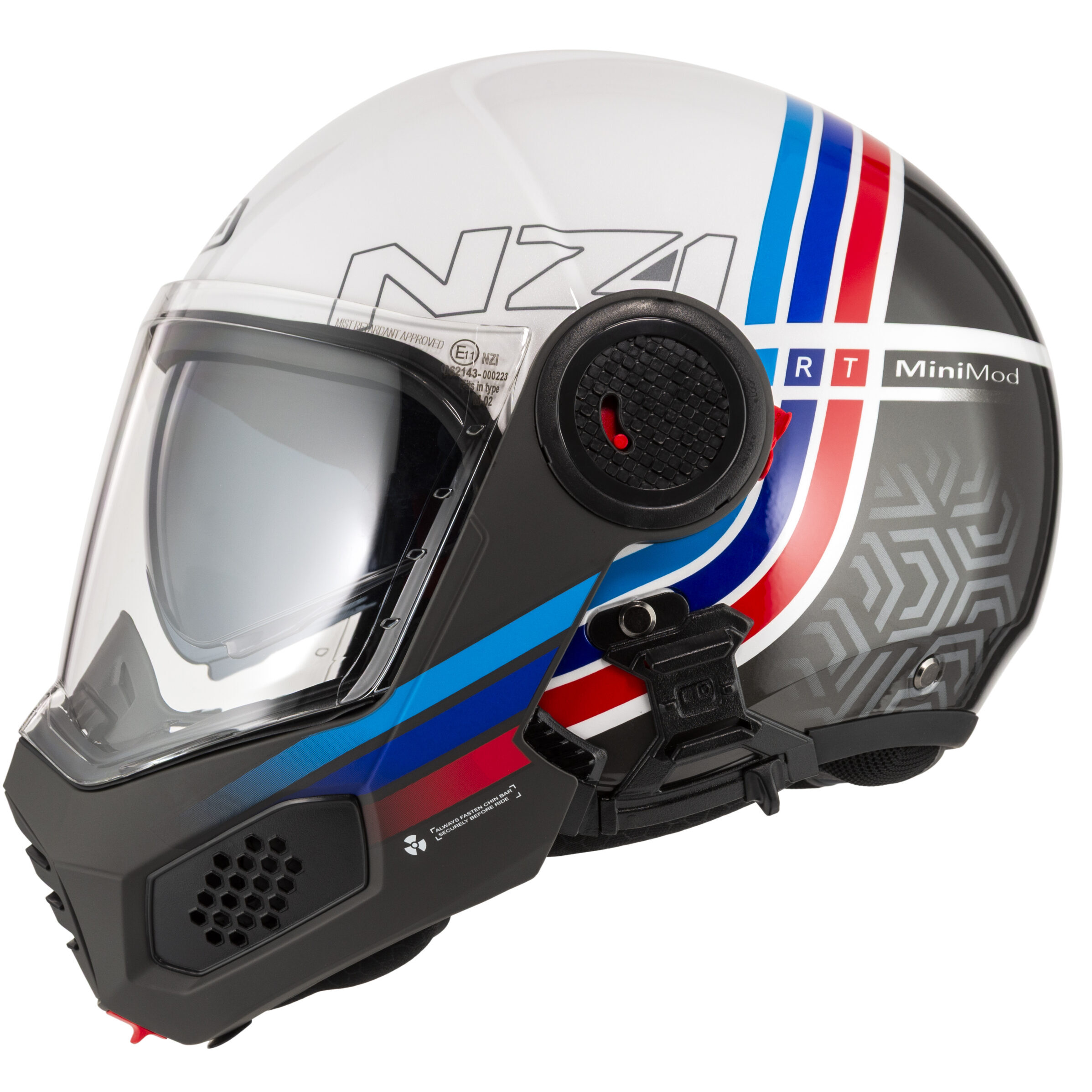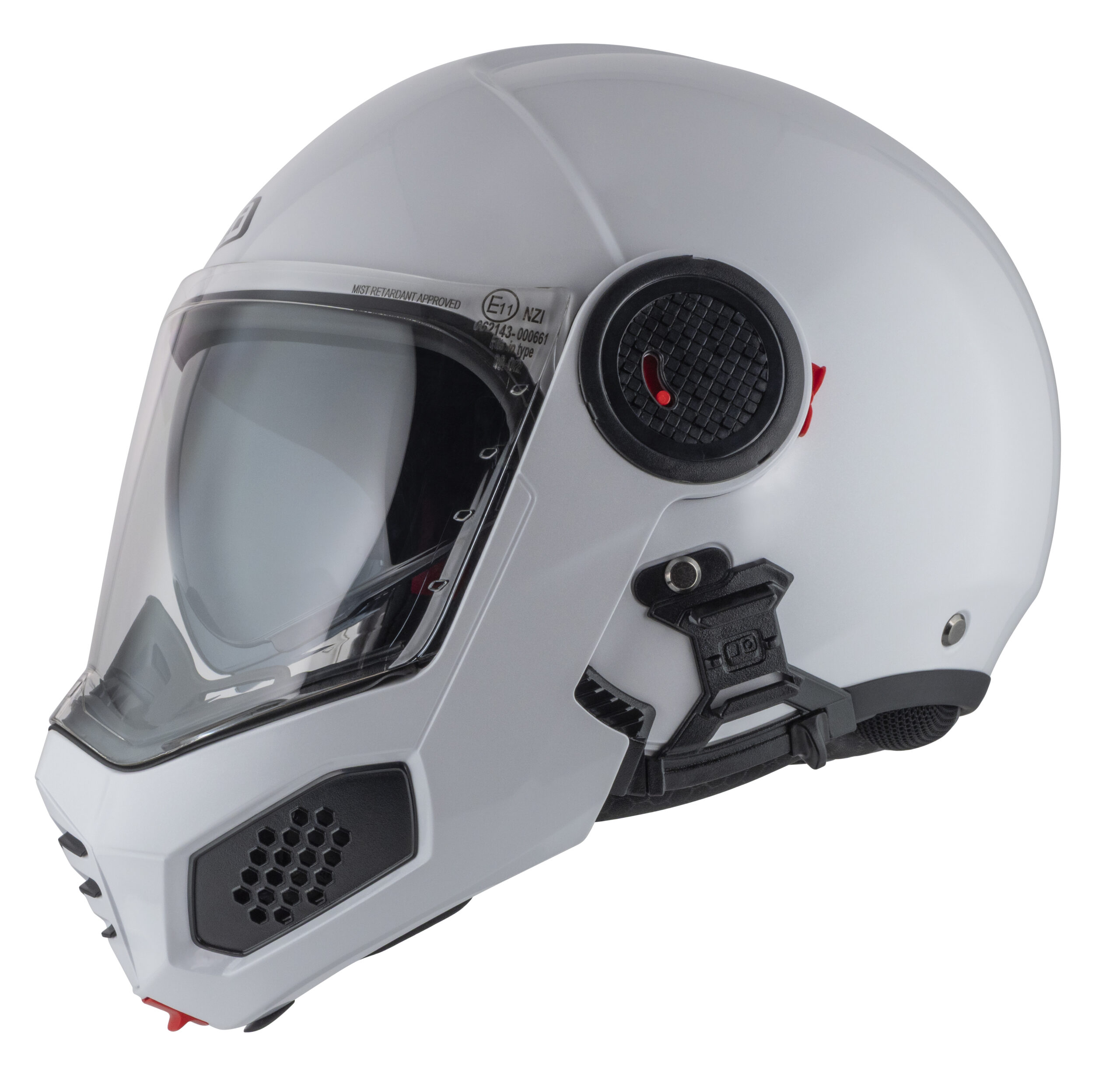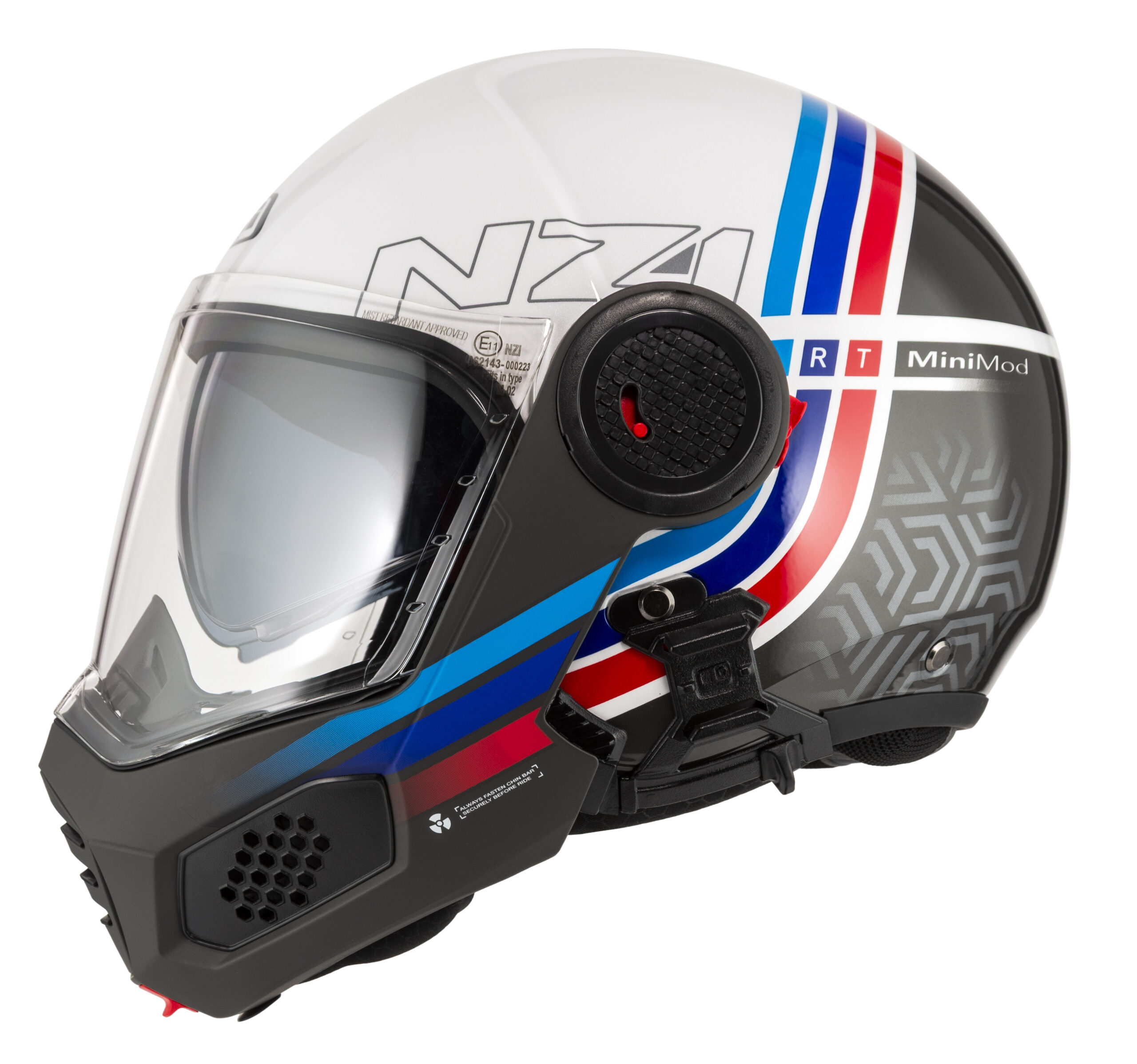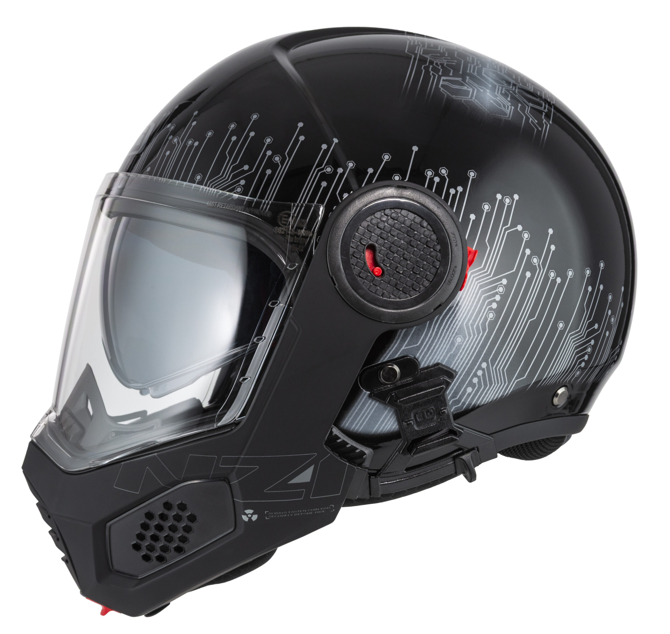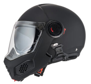 Hinged jaw protection locking mechanism made of reinforced metal. Reinforced retention system, harness with 4 straps to keep the helmet in place, on the head of the motorcyclist whatever direction the impacts come from.